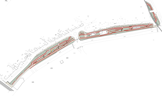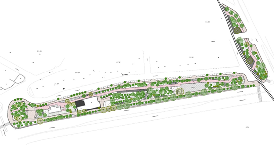 O νέος σχεδιασμός του πάρκου ακολουθεί την έντονη γραμμική διάταξη της περιοχής. Δημιουργούνται επάλληλες γραμμικές χαράξεις που εντάσσουν τις διαδρομές περιπάτου, τις φυτεύσεις και τις υπόλοιπες χρήσεις του πάρκου.